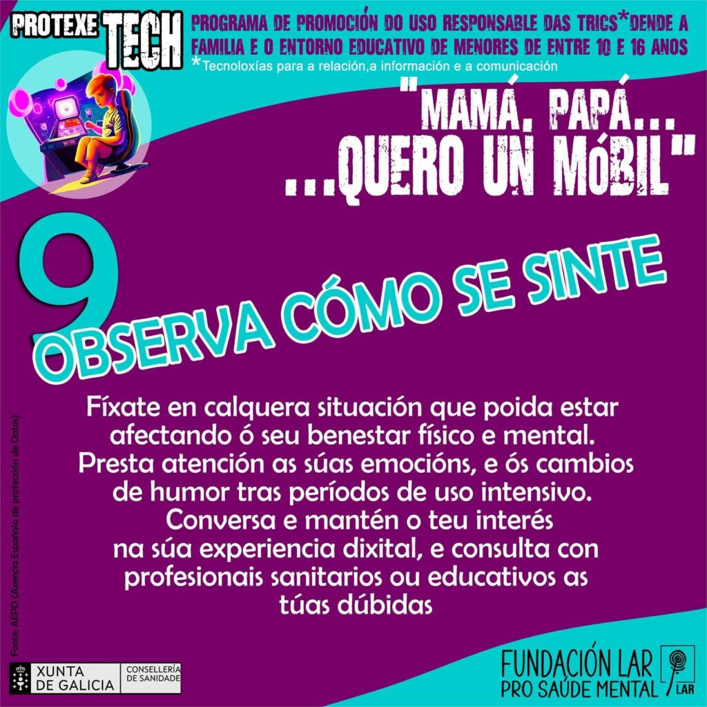 Hoxe compartimos 9 consellos prácticos que poden axudar ás familias a previr o uso inadecuado do teléfono móbil e as redes sociais. As imaxes inclúen recomendacións sinxelas pero efectivas para establecer límites e fomentar un uso consciente da tecnoloxía.