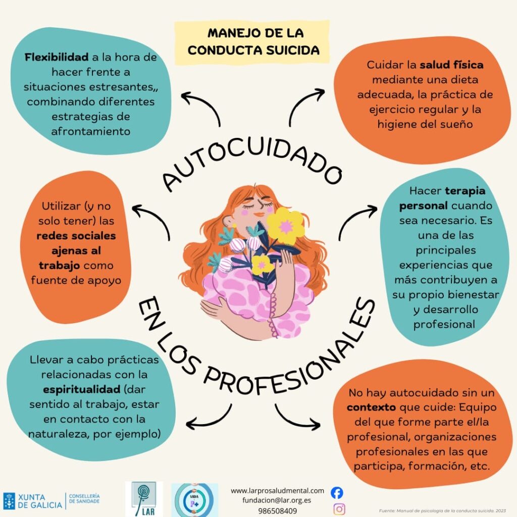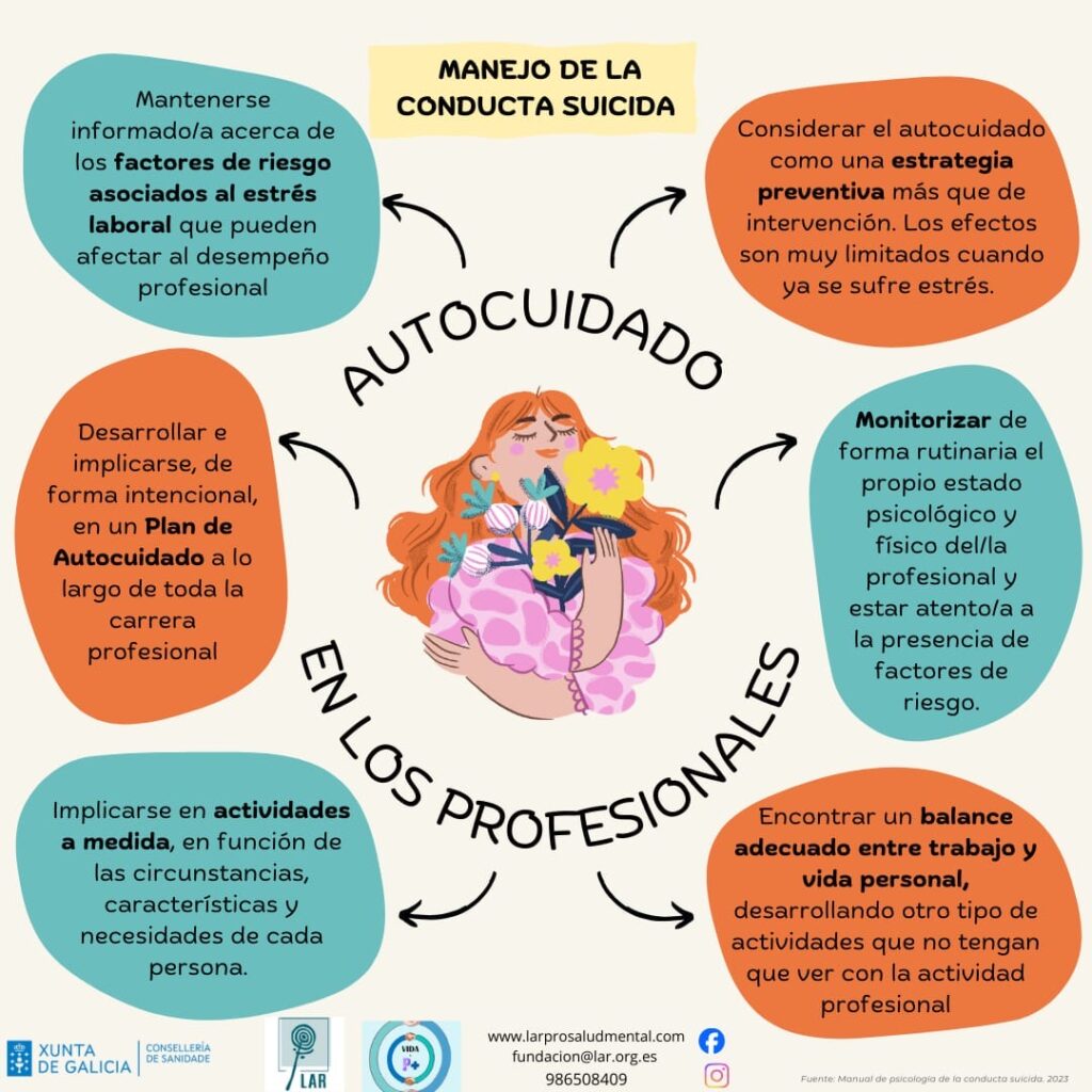 El trabajo del/la profesional que atiende a personas en riesgo de conducta suicida, va asociado al riesgo de sufrir una serie de experiencias que puedan perjudicar la salud del profesional y a las personas a las que presta sus servicios. No existe ninguna característica personal ni profesional que nos “inmunice” frente a esta posibilidad, por lo que debemos normalizarlo y poner todos los medios posibles para tratar de prevenirlo. El trabajo con personas que muestran conductas relacionadas con el suicidio es uno de los principales factores de riesgo. En el Programa VIDA P+, subvencionado por la Consellería de Sanidad, incidimos en la importancia de un Plan de Autocuidado. En esta infografía se recogen una serie de recomendaciones, basadas en la evidencia, que pueden servir a los/as profesionales sociosanitarios/as para guiar su propio Plan.